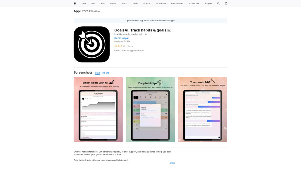 GoalsAI is an AI-powered habit and goal tracking app designed to help users build better habits. It creates personalized, science-backed habit plans based on individual goals, age, and lifestyle. The app allows users to track habits and goals separately, group them, add progression stages, use habit templates, chat with an AI coach, and add links in notes. It offers daily tips, visual progress tracking, and an AI chat assistant for motivation and support.