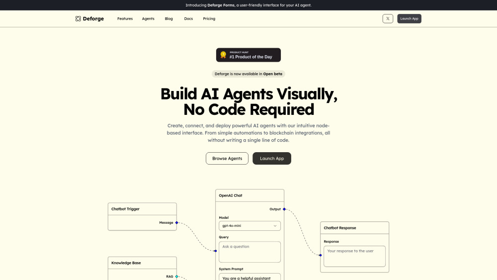 Deforge is a visual platform that simplifies the creation and deployment of AI agents. It condenses complex workflows into single nodes, enabling users to build powerful AI agents visually without writing any code. The platform supports a wide range of functionalities, from simple automations to blockchain integrations, and offers user-friendly interfaces like Deforge Forms for agent interaction and sharing.